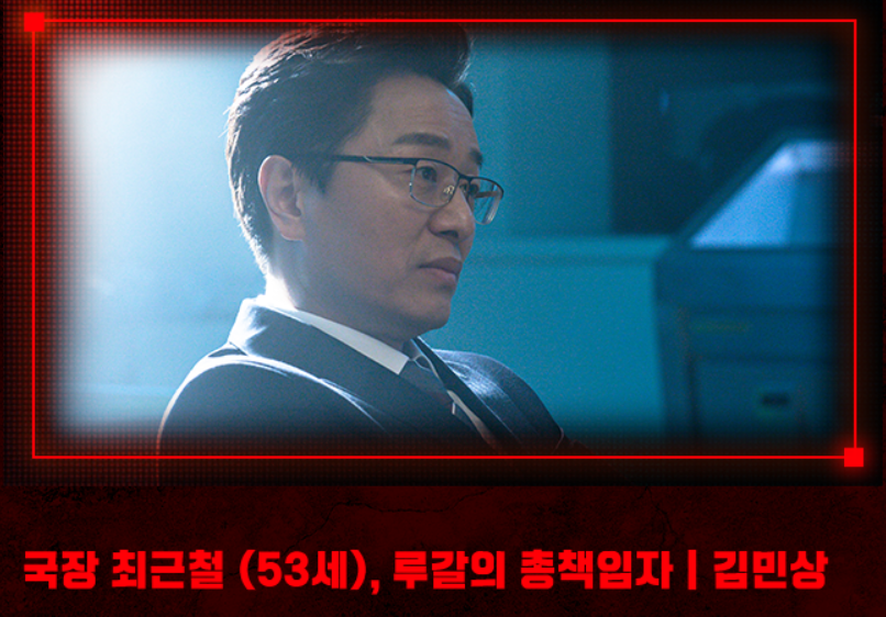 최근철 역할 (김민상) : 비밀 조직 루갈의 총책임자이며 경찰 고위 간부입니다.