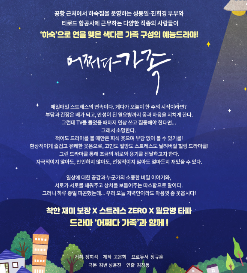 어쩌다 가족은 한 지붕 세 가족? 아니 두 지붕 한 가족! 피 한 방울 섞이지 않은 남남이 모여 어쩌다 진짜 가족이 되어가는 웃음과 감동을 주는 드라마라고 합니다.