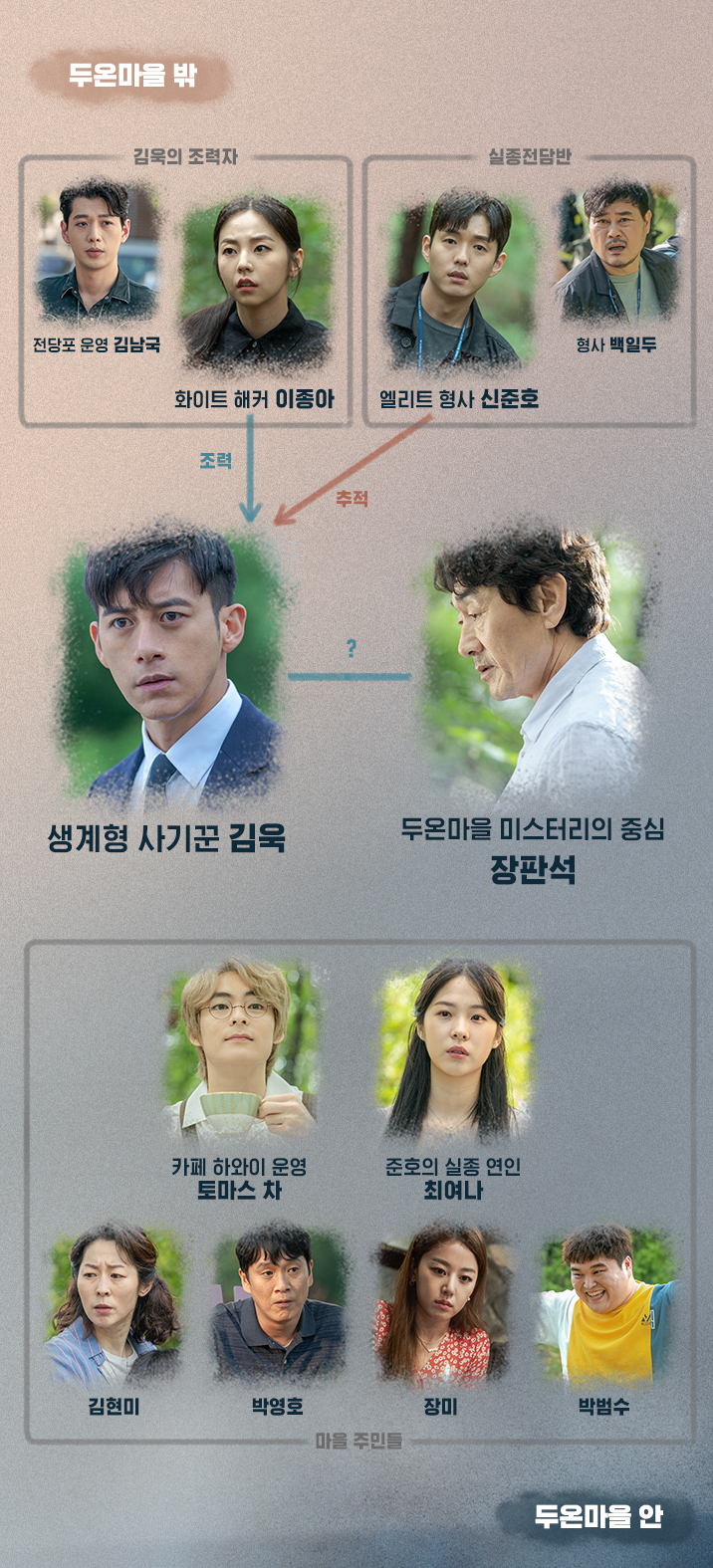 | 두온마을 미스터리 중심인물 장판석 / 허준호 두온마을과 바깥세상을 잇는 연결고리 역할을 합니다. |