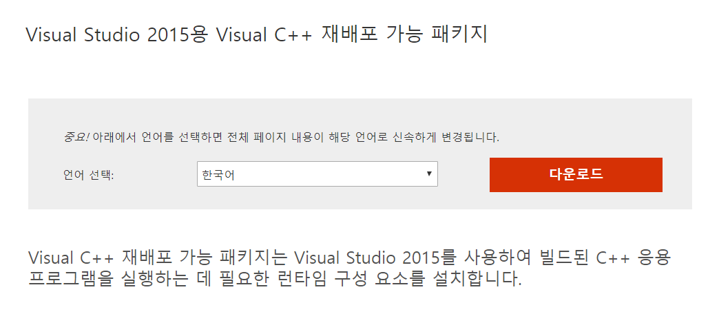 해당 현상에 대해서는 [visual studio 2015용 visual C++ 재배포 가능 패키지] 가 설치되어 있지 않아서 나타나는 메시지입니다.